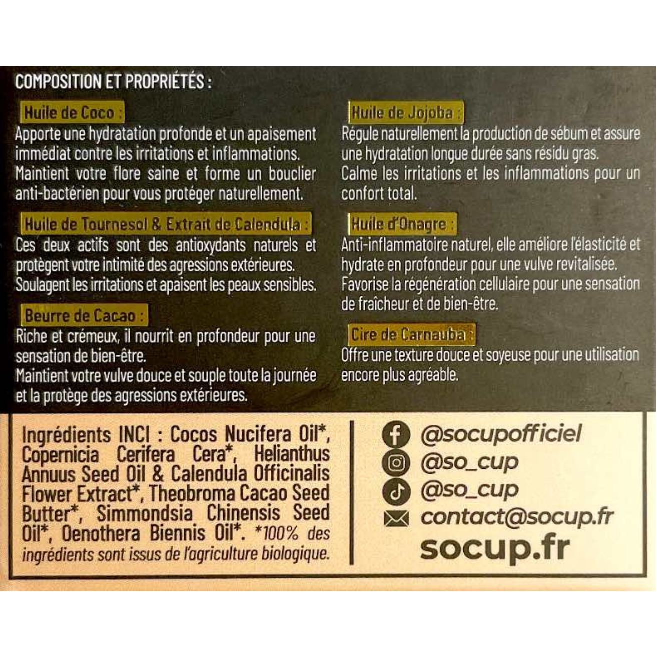Huile de Coco, Huile de Tournesol & Calendula, Beurre de Cacao, Huile de Jojoba, Huile d’Onagre, Cire de Carnauba